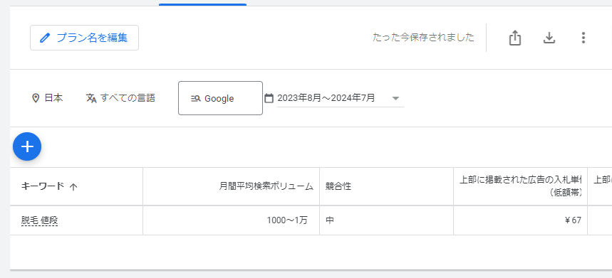 登録ができたら、実際にキーワードプランナーを使って検索数を調べることができます。