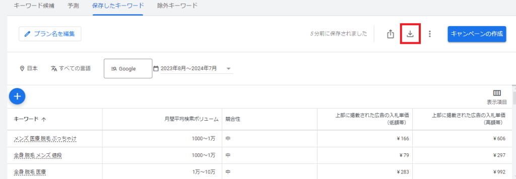 一度に大量のキーワードの検索数を調べたときはスプレッドシートにダウンロードしましょう。