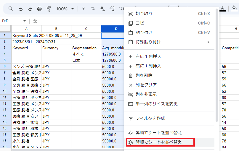 この検索数をGoogleスプレッドシートにダウンロードします。