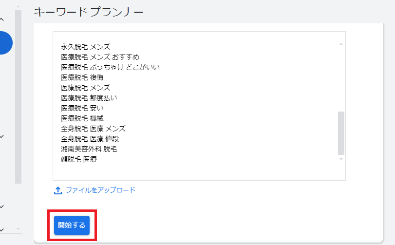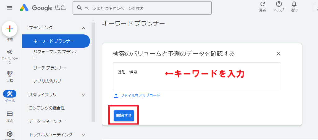 「検索のボリュームと予測のデータを確認する」のスペースにメモしておいたキーワードを入力し、「開始する」をクリックします。