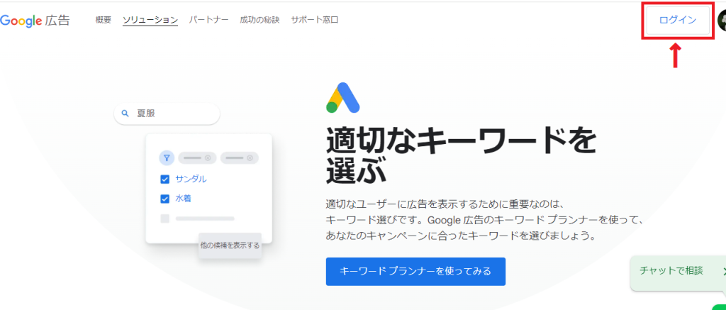 初めて使う場合はGoogle広告の「ログイン」をクリックし、Googleで利用しているアカウントがあればそちらを利用します。