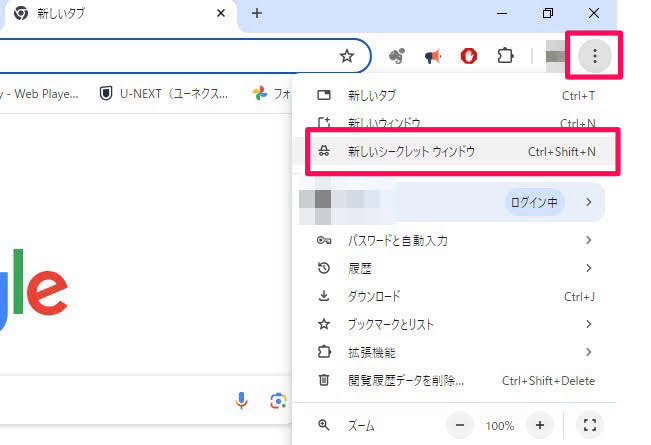 シークレットウィンドウはGoogle chromeの検索バーの右端の縦の「…」をクリックし、「新しいシークレットウィンドウ」をクリックすると開きます。