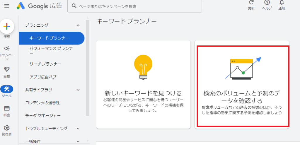 キーワードプランナーを開いたら、「検索のボリュームと予測のデータを確認する」をクリックします。