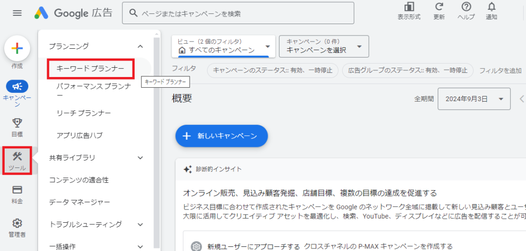 Google広告のホーム画面の「ツール」をクリックして「プランニング」の中の「キーワードプランナー」をクリックします。