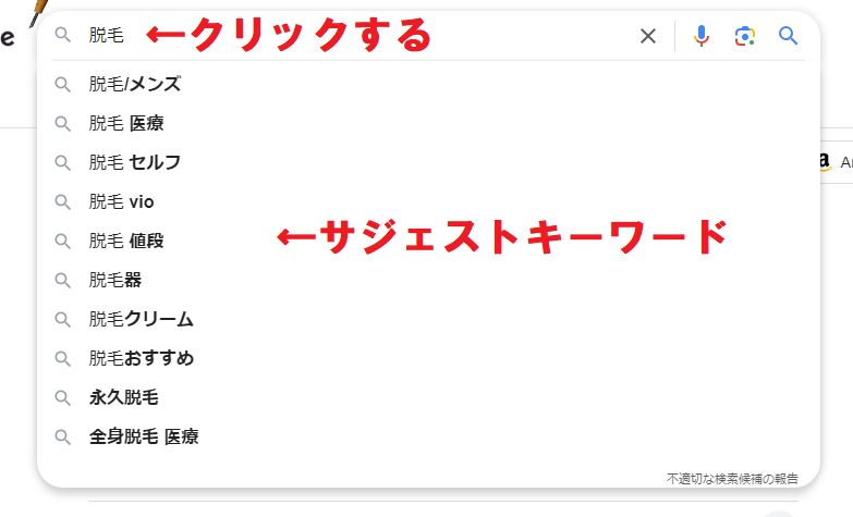 このサジェストキーワードをメモしておき、さらにサジェストキーワードのサジェストキーワードを探していくというように調べていくと、たくさんのキーワードが集められると思います。